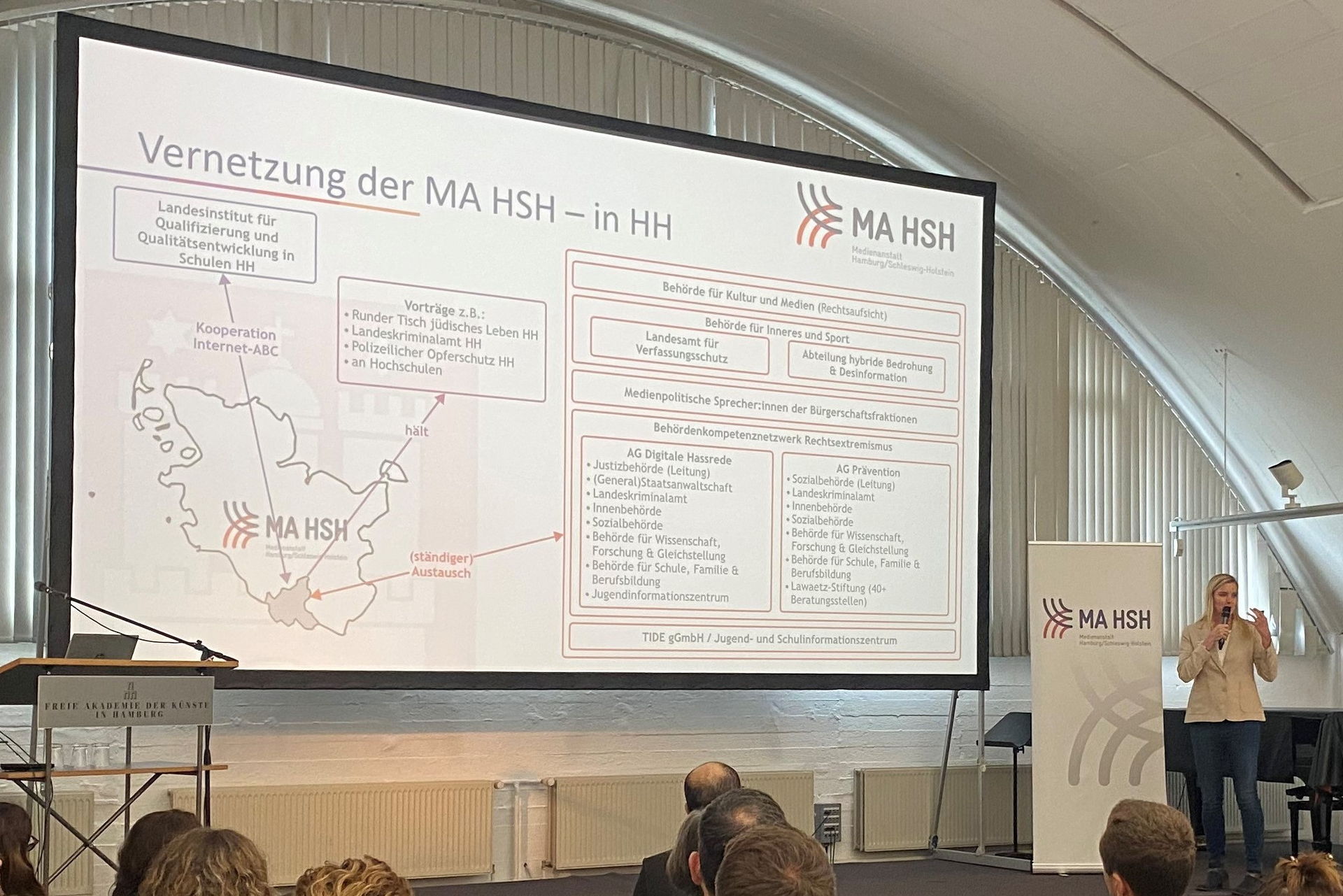 „Wer von Ihnen hat denn schon einmal mit einer Landesmedienanstalt zusammengearbeitet?“, fragt Eva-Maria Sommer, Direktorin der MA HSH, in ihrer Begrüßungsrede die Teilnehmer:innen. Einige Finger gehen in die Höhe. Immerhin, aber dennoch wird deutlich: Da ist noch Luft nach oben!